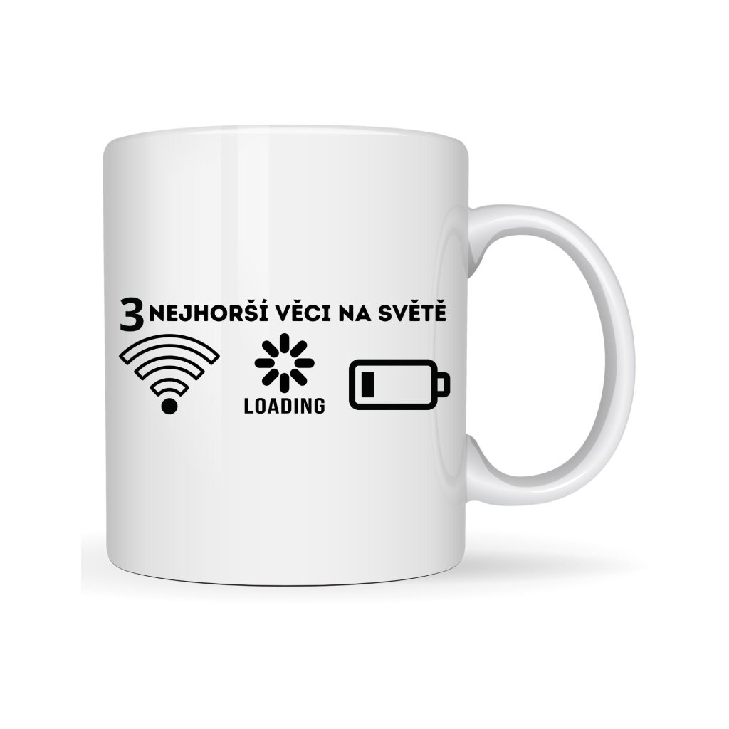 Vtipný hrneček s motivem „3 nejhorší věci na světě“ pobaví každého, kdo je zvyklý být neustále online. Nápis s humorem připomíná situace, které dokážou potrápit nejednoho moderního člověka – žádná WiFi, nekonečný loading a nulový signál.