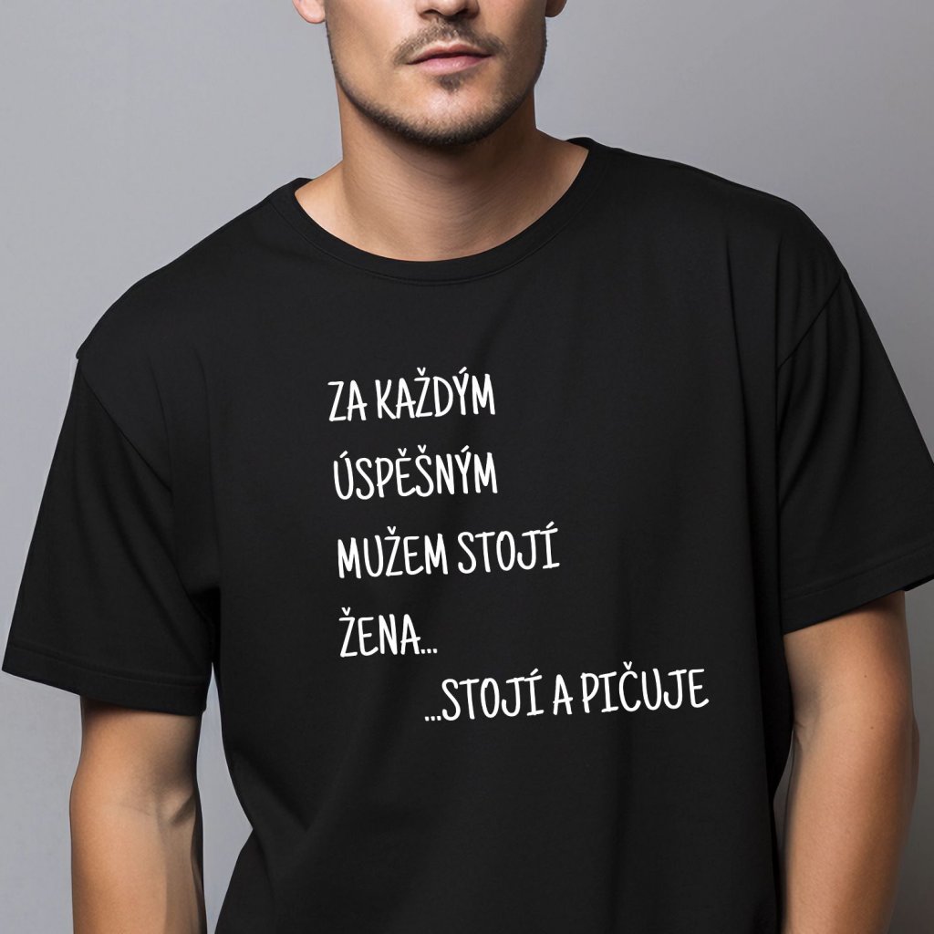 Pánské tričko - Za každým úspěšným mužem stojí žena. Stojí a pičuje.